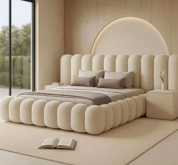 The Sofia is distinguished by its extra-wide headboard (Wide HB) that extends out from both sides of the bed. The headboard features deep, vertical stripes that create a sense of height and comfort. The color—a soft beige that leans toward off-white—gives the room a light and airy feel, while the luxurious velvet fabric adds a warm and inviting texture.
